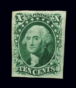 519 og 15 image#15, 10c Green, Ty. III, an extraordinarily handsome and choice mint example, in a quality which is rarely encountered on this, possessing an uncommon freshness which few classics from this era still retain, deep luxuriant color and impression, four large to very large margins, unusually clean full o.g. which has been lightly hinged, extremely fine; a stamp for the finest quality collection; 1992 PF and 1993 PSE certificates; ex-Weisman, Lessin. (Image) $5,000.00