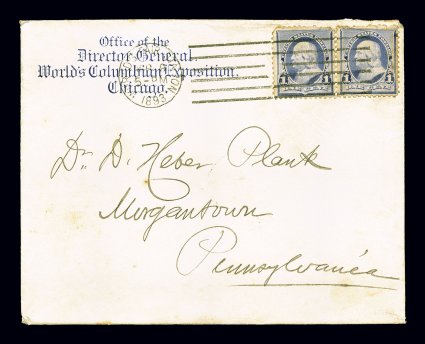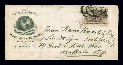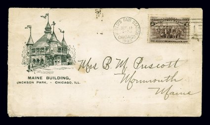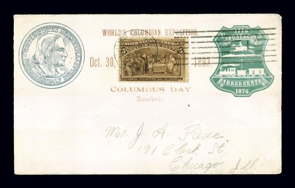 710 c 236 image#236, 8c Columbian, straight-edge at top, tied by World's Fair Station Oct. 30, 1893 machine cancel (Bomar #C93-12) on 3c Green Centennial entire (#U219) with Columbus Day imprint, addressed to J.A. Pierce, very fine. (Image) Est. 150-200