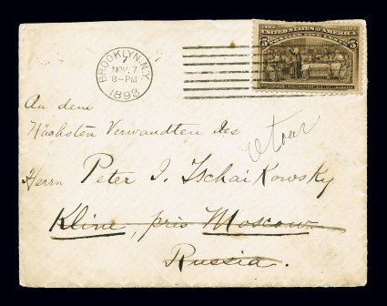 705 c 234 image#234, 5c Columbian, tied by Brooklyn, N.Y. Nov 7, 1893 machine cancel on cover Moscow, Russia, two Russian backstamps, the cover was undeliverable and returned to sender, fine. (Image) Est. 150-200