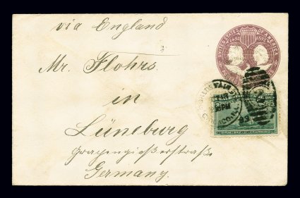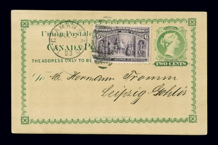 709 c 235 image#235, 6c Columbian, tied by "5" in oval grid, with German Sea Post Jul 6, 1893 pmk. on Canada 2c Green postal card, addressed to Leipzig, Germany, very fine; a most unusual usage. (Image) Est. 200-300