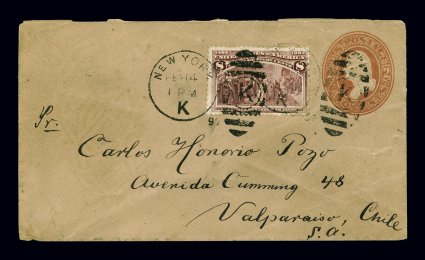 711 c 236 image#236, 8c Columbian, tied by New York K, Feb. 14, 1897 duplex pmks. on 2c Red on fawn entire (#U230) to Valparaiso, Chile, (backstamped), cover with minor tear at right not affecting stamps or markings, fine; a seldom seen destination. (Image) Est. 150-200
