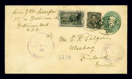 713 c 237 image#237, 10c Columbian, tied with 4c Brown (#269) by Baltimore oval registry pmks. on 4c Green entire to Finland, Baltimore, Nov. 3, 1898 purple registry pmk., New York and Finland backstamps, very fine; a scarcer European destination. (Image) Est. 150-200