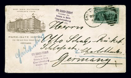 714 c 238 image#238, 15c Columbian, tied by Chicago Sept. 5 (1893) duplex on cover with Park-Gate Hotel illustrated corner card, and with the World's Fair building in background, sent to Germany, Stuttgart transit and backstamped at Charlottenburg, stamp with a couple faintly toned perf. tips and cover with small tear at bottom left corner, otherwise very fine; the higher values on illustrated covers are scarce. (Image) Est. 200-300