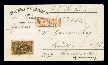 716 c 240 image#240, 50c Columbian, tied with 8c Columbian (#236) by Kingsbridge Stn., N.Y. oval pmks. on large registered cover to Germany, registry label also tied 8c, backstamped, cover with small faults, fine appearance; Scott catalog value $625.00. (imagea) (Image) Est. 200-300