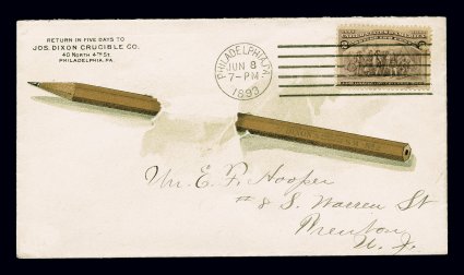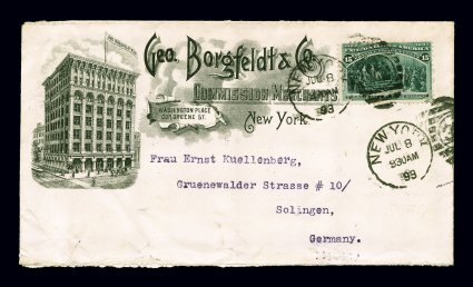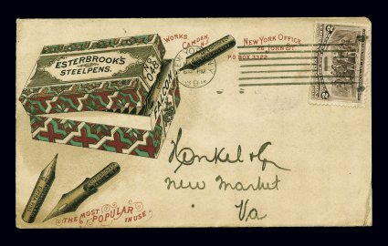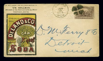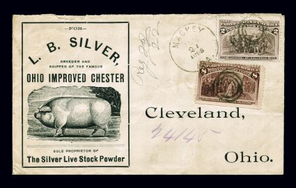 721 c 230/238 imageColumbian illustrated advertising cover lot of about 75 covers, values to 15c, but most are franked with a single 2c stamp, includes some multi-colored and several all-over designs, wide range of themes, including hotels, buildings, livestock, transportation, various manufacturers, etc., mostly very fine; an especially attractive and desirable group of advertising covers with the Columbian issue. (imagea) (imageb) (imagec) (imaged) (imagee) (imagef) (Image) Est. 1,500-2,000