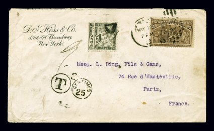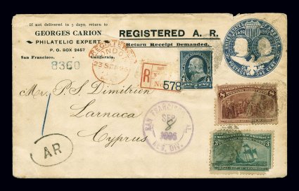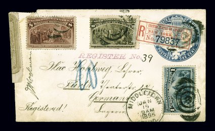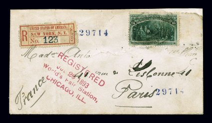 723 c 232/238 imageColumbian postal history balance of about 75 covers, values from 2c to 15c, +there is very little common material here, with many better items throughout including registered domestic and foreign usages, special deliveries, small towns, better cancels, early usages during January 1893, territorials, late usage on a Zeppelin flight cover, three off-cover stamps with Shanghai cancels, and much more, the vast majority are fine-very fine; a very useful lot for the Columbian postal history specialist. (imagea) (imageb) (imagec) (imaged) (imagee) (Image) Est. 1,500-2,000