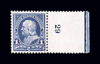 728 nh 247 image#247, 1c Blue, handsome right sheet-margin plate no. 29 single, excellent centering within wide margins, deep luxuriant color, o.g., n.h., extremely fine; 1993 PF certificate for a strip of three from which this stamp was taken and 2004 PF certificate as a plate number single. (Image) $200.00