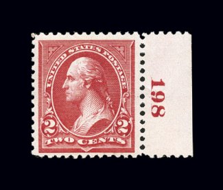 732 nh 252 image#252, 2c Carmine, Ty. III, right sheet-margin plate no. 198 single, marvelously well centered within four extravagantly large margins, bright vibrant color and a crisp impression, o.g., n.h., extremely fine; seldom encountered in this extraordinary quality; 2000 PF certificate. (Image) $350.00