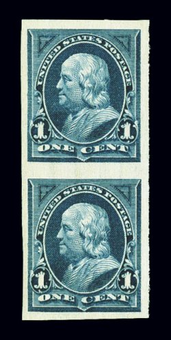 746 og 264c image#264c, 1c Blue, imperforate, vertical pair, large margins all around, deep rich color, o.g., l.h., extremely fine. (Image) $275.00