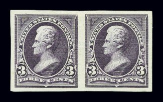 753 og 268a image#268a, 3c Purple imperforate, horizontal pair, large even margins, rich color, o.g., extremely fine; 1995 PF certificate; ex-Floyd. (Image) $275.00