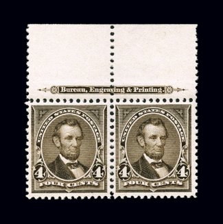 754 nh 269 image#269, 4c Dark brown, eye-catching full top sheet-margin imprint pair, extraordinarily well centered and margined, especially intense color and prooflike impression, o.g., n.h., extremely fine and handsome pair; 2000 PF certificate. (Image) $250.00