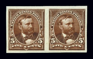 757 nh 270b image#270b, 5c Chocolate, imperforate, horizontal pair, large margins all around, lovely rich color, o.g., n.h., tiny tear in right margin, extremely fine appearance. (Image) for hinged $275.00