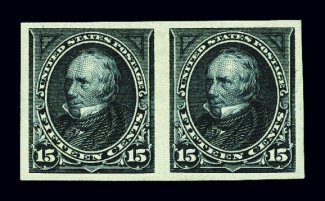 762 og 274a image#274a, 15c Dark blue, imperforate, horizontal pair, large margins, deep luxuriant color and an especially intense impression on fresh white paper, o.g., lightly hinged, extremely fine; a very scarce error pair; 1994 PF certificate. (Image) $1,100.00