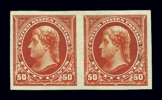 763 og 275b image#275b, 50c Orange imperforate, horizontal pair, large margins all around, strong color and impression, o.g., lightly hinged, extremely fine; especially rare in this choice quality; 1994 PF certificate. (Image) $1,250.00