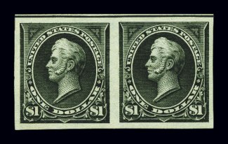 765 og 276b image#276b, $1.00 Black, Ty. I, imperforate, a remarkably choice horizontal pair of this imperforate rarity, marvelously fresh, with intense color and a razor-sharp impression on bright paper, large well balanced margins all around, pristine o.g. with just the barest trace of a hinge mark, extremely fine; a gem pair that is completely free of the faults which seem to affect so many of the Bureau issue imperforates; only 50 pairs can possibly exist; 1991 PF certificate for a block of four, this being the bottom pair; ex-Floyd. (Image) $1,600.00