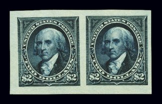 768 og 277b image#277b, $2.00 Bright blue imperforate, a most impressive horizontal pair, featuring huge margins all around, eye-arresting deep intense color and a remarkably vivid impression on bright white paper, o.g., lightly hinged, extremely fine; certainly one of the finest pairs of the 50 that are possible. (Image) $3,500.00