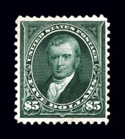 771 og 278 image#278, $5.00 Dark green, unusually fresh mint example, with deep luxuriant color and an especially vivid impression on clean white paper, o.g., lightly hinged, very fine; 2001 PF certificate. (Image) $2,300.00