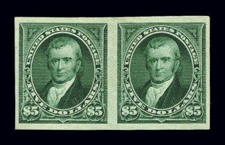 772 og 278a image#278a, $5.00 Dark green imperforate, handsome horizontal pair of this imperforate rarity, large margins all around, deep luxuriant color, o.g., extremely fine; only 50 pairs can possibly exist, many of which are found with gum faults; 1992 PF certificate; ex-Floyd. (Image) $3,500.00