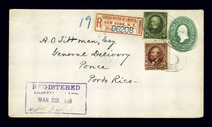 776 EDU 284 image#284, 15c Olive green, tied along with 6c Lake (#282) to 2c Green entire (#U311) by Boston oval pmks., March 22 boxed registry handstamp at bottom left, sent to Puerto Rico, with April 1, 1899 receiving backstamp, making this the earliest documented usage, beating the currently listed date of May 1, 1899 by over a month, registry label overlaps 15c stamp, very fine; only recently discovered and offered for the first time; 2005 PF certificate. (Image) Est. 500-750