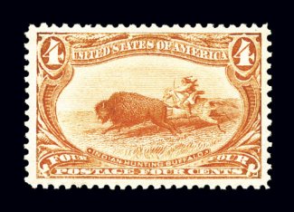 777 ng 287 image#287, 4c Trans-Mississippi, unused, excellent centering within extraordinarily large margins, attractive color, regummed, extremely fine; 1990 PF certificate (o.g., n.h. by omission) and a 2005 PSE certificate. (Image) $140.00