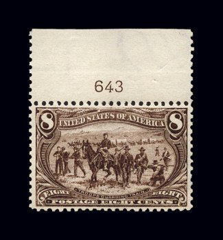 778 nh 289 image#289, 8c Trans-Mississippi, top margin plate no. 643 sheet-margin single, beautifully centered, with larger margins than normally found on this difficult value, especially deep luxuriant color and an intense impression, fresh o.g., n.h., extremely fine. (Image) $475.00