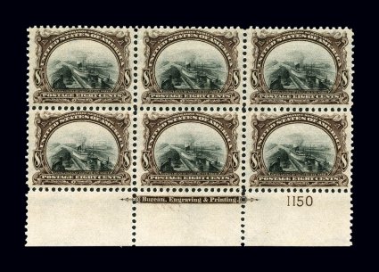 802 ogPB 298 image#298, 8c Pan-American, a most impressive quality full bottom margin imprint and plate no. 1150 block of six, featuring incredibly deep and luxuriant colors, plus its overall centering is quite select, marvelously fresh, o.g., stamps n.h., lightly hinged in ungummed portion of sheet selvage only, extremely fine; a lovely example of this rare plate block; 1991 PF certificate. (Image) $4,000.00