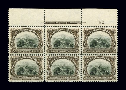 803 nhPB 298 image#298, 8c Pan-American, top margin imprint and plate no. 1150 block of six, deeply rich color, nicely centered, pristine o.g., never hinged, very fine; a handsome example of this very scarce plate block; 2001 PF certificate. (Image) $6,000.00
