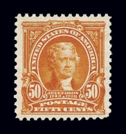 808 og 310 image#310, 50c Orange, handsome mint single, with extraordinarily wide and well balanced margins all around, intense vivid color and a strong impression on bright paper, o.g., lightly hinged, extremely fine; 2003 PF certificate. (Image) $475.00