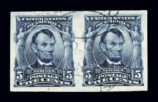 816 O 315 image#315, 5c Blue imperforate, a magnificent used horizontal pair, possessing extra-large and wonderfully well balanced margins, luxuriously rich color and a sharp impression, very light and unobtrusive "Washington/D.C." oval cancels, extremely fine; a gem example of this very rare used pair believed to be the finest of the less than nine pairs that have been certified by the Philatelic Foundation; the frequently offered fake or non-contemporaneous cancels on this issue have kept the catalog value unrealistically low in comparison to the incredible rarity of genuine used examples; 1997 PF certificate. (Image) $2,750.00