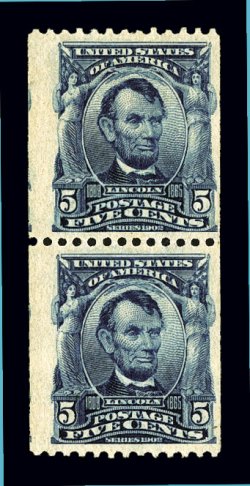 817 og 317 image#317, 5c Blue coil, perf. 12 horiz., an incredibly fresh mint pair of this experimental coil rarity of which fewer than ninety pairs are recorded, in a much more brilliant state of preservation than the vast majority, with strikingly intense color and a crisp detailed impression on considerably brighter paper than usual, quite well centered within unusually large margins, full clean o.g., top stamp with minor h.r., bottom stamp lightly hinged, very fine; light MeKeel guarantee handstamps on reverse and accompanied by a 1987 PF certificate. (Image) $15,000.00