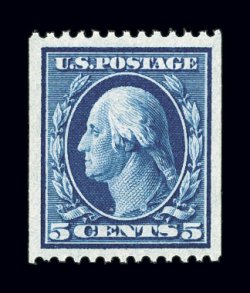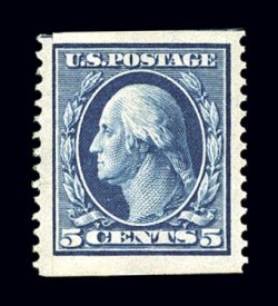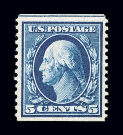 850 nh 355 var. image#355 var., 5c Blue coil, perf. 12 vert., mint paste-up single with hidden partial arrow marking, fresh with deep color and clean impression, remarkably well centered, o.g., n.h., extremely fine; an interesting variety of these early coil issues; photocopy of a 1996 PSE certificate, this being the left stamp. (Image) $490.00