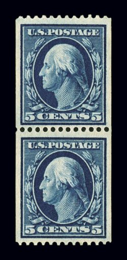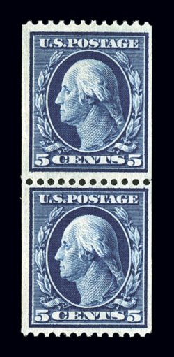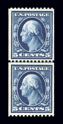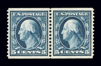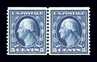 848 og 355 image#355, 5c Blue coil, perf. 12 vert., amazingly choice mint pair , perfectly centered within large margins all around, deep rich color and a crisp detailed impression, o.g., lightly hinged, extremely fine; an especially scarce coil pair so well centered; 1999 PSE certificate; ex-Lyons. (Image) $575.00
