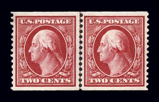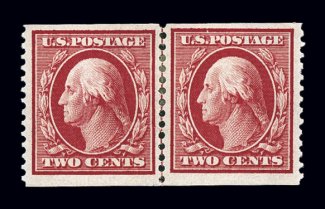 845 og 353 image#353, 2c Carmine coil, perf. 12 vert., an especially handsome guide line pair, exceedingly well centered within uncharacteristically large margins, deeply rich color and a well incised impression on bright white paper, o.g., left stamp n.h., right stamp very lightly hinged, extremely fine; a very scarce line pair in this premium condition; 2001 PSE and 2005 PF certificates. (Image) $750.00