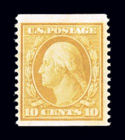 851 og 356 image#356, 10c Yellow coil, perf. 12 vert., an unusually fresh and clean mint example of this coil rarity, possessing an exceptional overall freshness and brilliance, with truly eye-arresting vibrant color characteristic only to genuine examples, unusually well centered as well, with large margins all around, pristine o.g. that has only been very lightly hinged, extremely fine; certified singles of #356 are a challenge to find, particularly in this select quality; 1990 and 2003 PF certificate (Image) $2,850.00