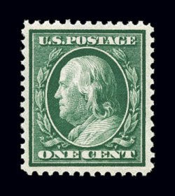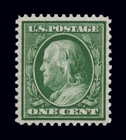 853 og 357 image#357, 1c Green on bluish paper, marvelously well centered within large and perfectly balanced margins, lovely rich color, o.g., barest trace of hinging (if any), extremely fine; 1991 PF certificate (n.h. by omission) and a 2005 PF certificate. (Image) $100.00