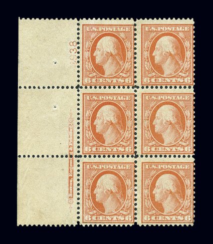 854 ogPB 362 image#362, 6c Red orange on bluish paper, a very rare full left margin imprint and plate no. 4938 block of six, attractive color, o.g., fine; only a handful of Six Cent Bluish Paper plate blocks exist, in fact, this is only the second example we have ever offered in our auctions (the other being the ex-Wampler plate block). (Image) $16,000.00