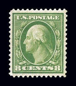 855 og 363 image#363, 8c Olive green on bluish paper, incredibly well centered within large margins although reperforated at right, sumptuously rich color and a prooflike impression, o.g., extremely fine appearance.For many years this was considered the finest example of the Eight Cent Bluish Paper. It was always offered as such when it made its appearance at auction (including in the Clifford Cole sale in 1988) and was accompanied by a clear 1974 PF certificate. Only recently has the PF changed its opinion and noted the reperforation at right. The PSE also agreed with the current PF opinion.A spectacular appearing example of this great 20th century rarity. Accompanied by 1974 and 2005 PF certificates, and a 2005 PSE certificate. ex-Cole. (Image) $27,500.00