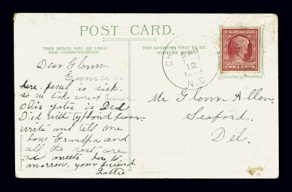 857 FDC 367 image#367, 2c Lincoln, straight-edge single tied by "Chadbourn, N.C./Feb 12, 1909" first day postmark on Valentines picture postcard, sent to Delaware, stamp with minor gum staining along left perf. tips and postcard with a few light soiling spots and crease at top left, very fine appearance; only four first day covers have been recorded from North Carolina and this is the only one from this city. (Image) $500.00