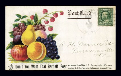 859 c 374 imageW.P. Rupert & Son fruit advertising post card, of Seneca, N.Y., showing a colorful fruit display, with 1c Green (probably #374) tied by Seneca Mar. 1, 1911 c.d.s., sent to Pennsylvania, reverse with typewritten sales notice, very fine; a lovely advertising card. (Image) Est. 200-300