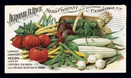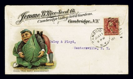 860 c 375 imageJerome B. Rice Seed Co. illustrated envelope of Cambridge, N.Y., with spectacular front and back illustrations of various vegetables, 2c Carmine (probably #375) tied by Cambridge, Jan. 11, 1911 duplex pmk., sent to Westernville, very fine; an incredibly attractive and colorful illustrated cover. (imagea) (imageb) (Image) Est. 300-400