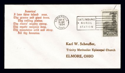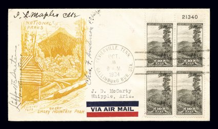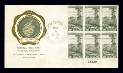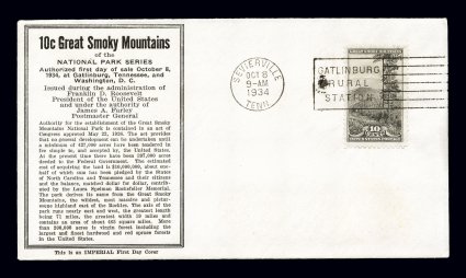 978 FDC 740/770 #740/770, 1c-10c Parks, valuable balance of an important specialized collection of first day covers, over 100 different, items, with many complete sets of the perforated issue, also some of the imperforate sets as well as the 1c and 2c souvenir sheets, nearly all are cacheted, including sets of Bates, Dyer, Parsons, Roessler, Top Notch, Roy, Grimsland, Anderson, Fairway, Open Book, Hubbard, Rice, Selby and many more, also some handpainted by Melissa Fox and others, plus there are full souvenir sheets, foreign destinations, complete sets on a single cover, a few USS Macon, etc., a few with light toning bands from the gummed envelope as often happens on these, but overall a very fine lot with many scarce cachets; the total retail value of this impressive holding will be many times our estimate. Est. 3,000-4,000