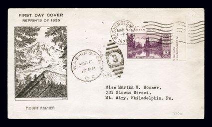 976 c 770a image#770a, 3c Parks imperforate tied to Fawcett cacheted cover by Mar. 8, 1935 Washington, D.C. duplex, cancelled seven days before the release of the reprints, proving that this was one of the original "Farley Follies", very fine; only a small number of these exist. (Image) Est. 300-400