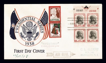 979 FDC 834 image#834, $5.00 Coolidge, top margin arrow and plate nos. F22167, 22168F block of four tied to cacheted first day cover by Washington, D.C., Nov. 17, 1938 machine cancel, two Christmas Seals also tied, ms. date at bottom left, plate block is exceptionally well centered, very fine. (Image) Est. 150-200