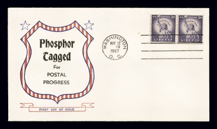 983 FDC 1057d image#1057d, 3c Deep violet coil, tagged, small holes, from the original printing made especially for "Look" magazine, pair tied to Boerger cacheted FDC by "Washington, DC/May 12, 1967" machine cancel, this is the date that these stamps were placed on philatelic sale to the public in Washington, fresh and very fine; this particular tagged stamp was specially printed and delivered to "Look" magazine in October of 1966, the earliest documented use is listed as December 29, 1966 by Scott as a commercial use by "Look" magazine, all of which are great rarities, undelivered portions of that printing were first put on sale at the philatelic window on this May 12,1967 date, Alfred Boerger, the tagging specialist, was the only one to make these covers and he had them priced at $500.00 in his last price list of 1993; this is not to be confused with the later June 26, 1967 philatelic printing of this tagged coil (Scott #1057b) that was re-issued to satisfy philatelic demand because of the scarcity of the earlier printing. (Image) Est. 400-500