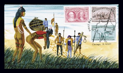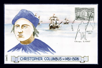990 FDC 2624-29 image#2624-29, 1c-$5.00 Columbians cplt., set of sixteen values on six Kober handpainted first day covers, Chicago cancels, very fine; one of the most beautiful and intricate of all the handpainted designs of this issue. (Image) Est. 400-500