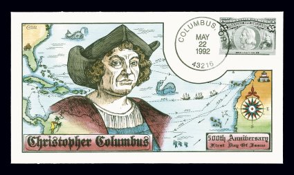 991 FDC 2624-29 #2624-29, 1c-$5.00 Columbians cplt., group of first day covers, includes complete sets of souvenir sheets on Anagram, Artmaster, Colorano Silk, Criscuoli, Pugh (handpainted), and S&T (both U.S. and Portugal) cachets, a set of singles with Artcraft cachets, set of singles on six Huehl handpainted FDC's, set of singles on six Ziola Powell handpainted, three David Dube handpainted cachets including two that join together to make a map of Columbus's voyage, set of singles on replica Goldsmith cards, the KMC Venture folder, and a few other items, very fine. Est. 500-750