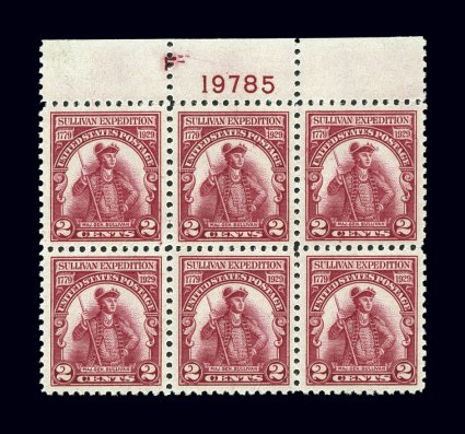 995 nhPB 657a image#657a, 2c Sullivan, lake shade, top margin plate no. F19785 block of six, incredibly well centered throughout the plate, strong color in the true lake shade, o.g., n.h., extremely fine; certainly one of the finest (if not the finest) of the few known plate blocks of this scarce color variety; 2001 PSE certificate. (Image) $3,750.00