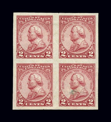 997 ogbl 689a image#689a, 2c Von Steuben, imperforate, block of four, large balanced margins all around, strong rich color, o.g., lightly hinged, light natural gum bends, small black mark on back just shows through to the front on the bottom right stamp, otherwise extremely fine; only one sheet of 100 stamps was issued, and blocks are exceptionally rare. (Image) $5,500.00+