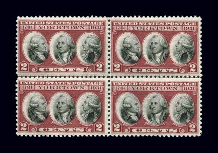 999 nhbl 703b image#703b, 2c Yorktown, dark lake and black error of color, very scarce mint block of four, with horizontal guide line, deep lake color, o.g., n.h., fresh and fine; 2000 PF certificate. (Image) $2,900.00