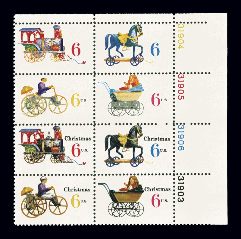 1021 nhPB 1415b, 1416b image#1415b, 1416b, 6c Toys se-tenant block, black omitted on top two stamps, right margin plate number block of eight, with the top two stamp having the black completely omitted, the next two stamps with the black partially omitted, and the bottom block normal, o.g., n.h., trivial gum disturbance on one stamp, very fine; an immensely rare transitional error block, which may be unique in this format; not yet priced in Scott in this format, cataloged simply as two error singles; 2001 PF certificate. (imagea) (Image) $5,000.00+
